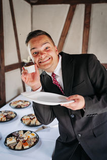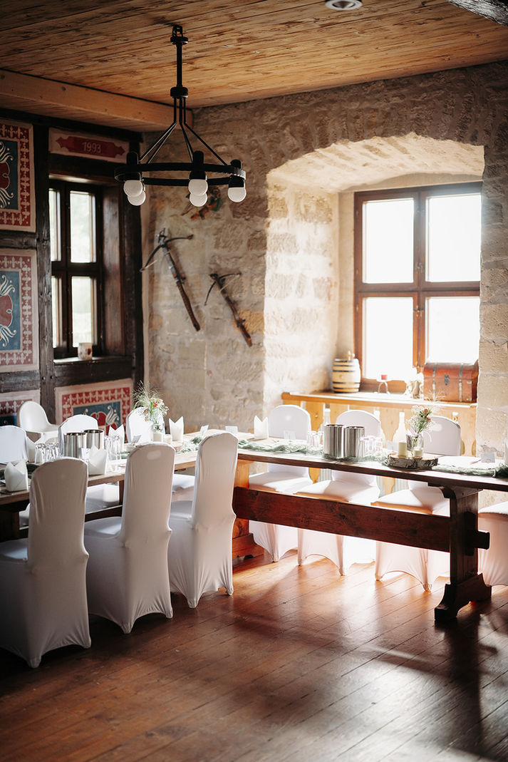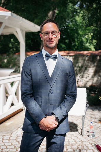 Dieses Jahr haben wir die freie Trauung von Nico und Lisa in der Wasserburg Markvippach begleitet. Der Tag begann mit Getting Ready in getrennten Hotelzimmern direkt im Dachgeschoss der Burg. Die Stimmung war von Aufregung und Vorfreude geprägt. Genau hier entstanden die ersten emotionalen Bilder: letzte Handgriffe beim Styling, das Binden der Fliege, das Hochstecken der Haare und die liebevollen Momente mit den Trauzeugen. Danach folgte ein berührender First Look mit den Eltern.