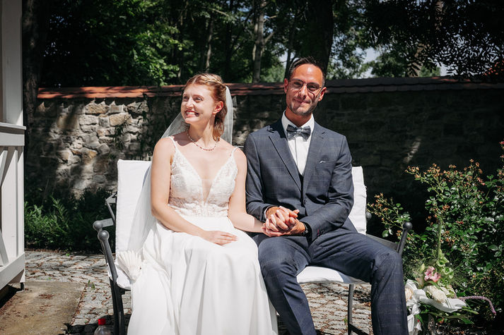 Die Trauung selbst fand im Pavillon im Garten der Wasserburg Markvippach statt. Umgeben von Bäumen, Vogelgezwitscher und viel Grün gaben sich Nico und Lisa das Ja-Wort. Ein besonderes Highlight war ihr Hund Stella als Ringträgerin. Außerdem wurden emotionale Briefe an alle Gäste verteilt – kleine Details, die den Tag persönlich machen und auf Fotos stark wirken. Als Hochzeitsfotografen in der Wasserburg Markvippach halten wir genau solche Momente sensibel und authentisch fest.